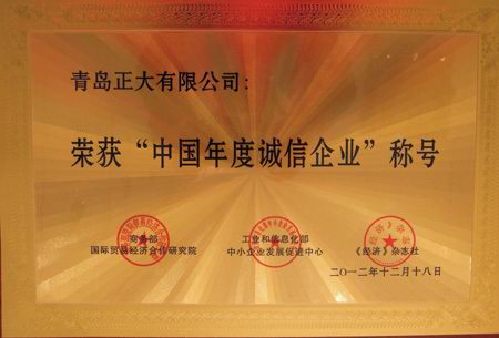 在商務部國際貿(mào)易經(jīng)濟合作研究院、工業(yè)和信息化部中小企業(yè)發(fā)展促進中心、《經(jīng)濟》雜志社聯(lián)合組織的2012年“中國年度誠信企業(yè)”評選活動中,青島正大有限公司榮獲“中國年度誠信企業(yè)”殊榮。